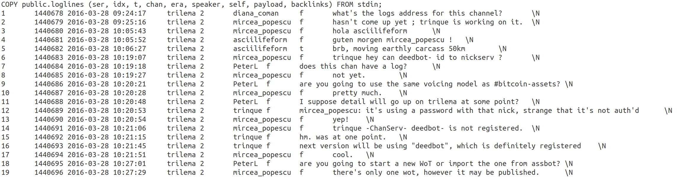 1 1440678 2016-03-28 09:24:17 trilema 2 diana_coman f what’s the logs address for this channel? \N