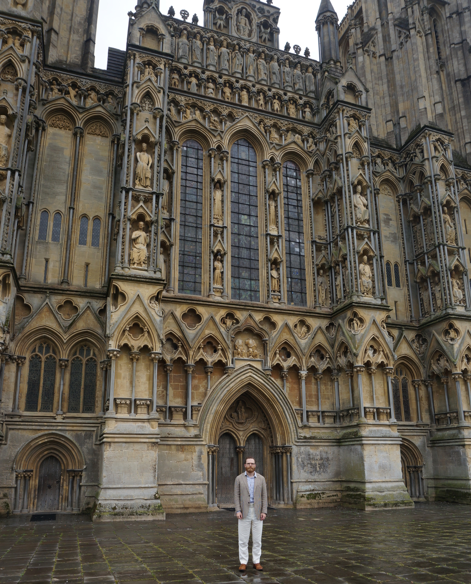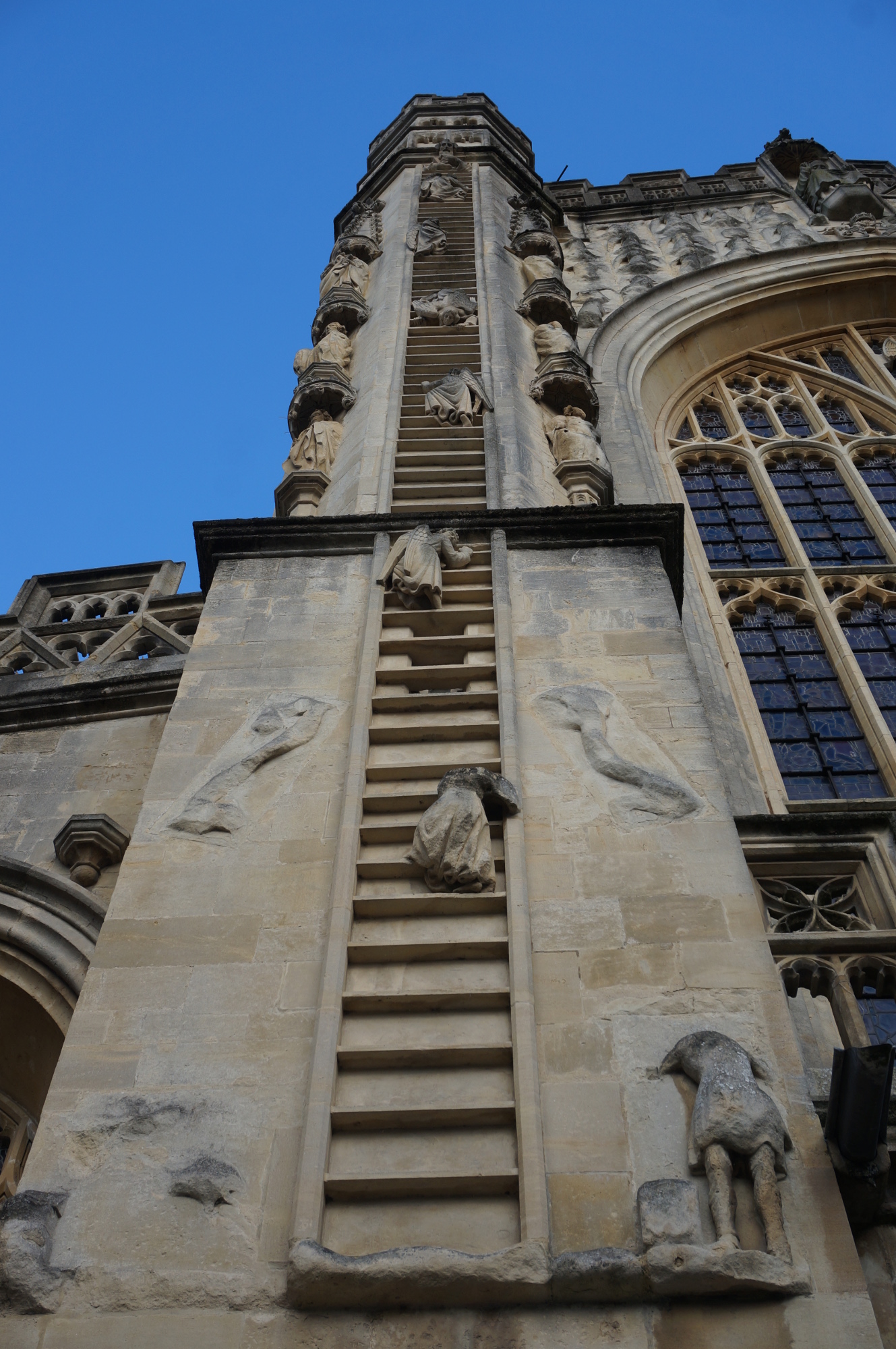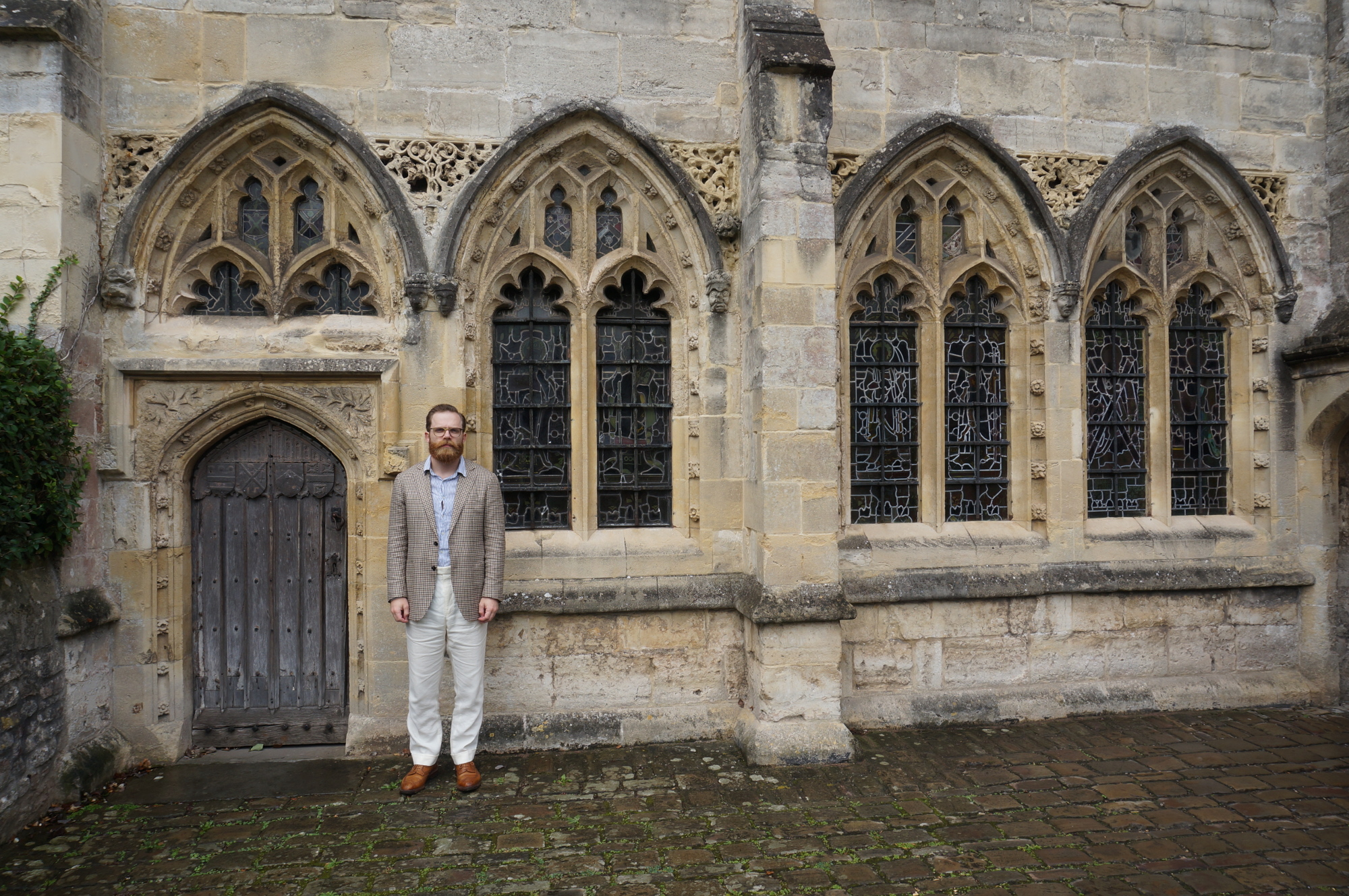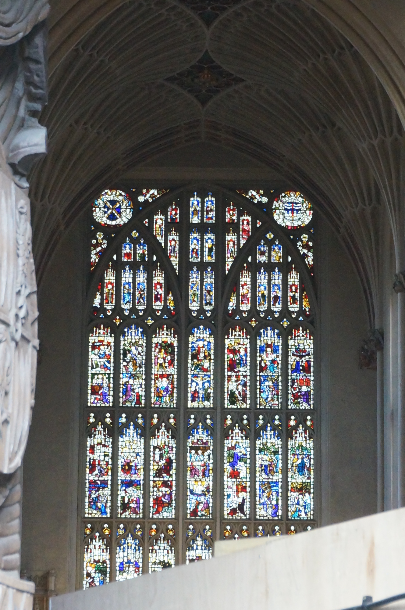 It was cattle-only inside, but I managed to get a shot of the fan-vaulted ceilings and stained glass through the one-way cattle herding exit:
