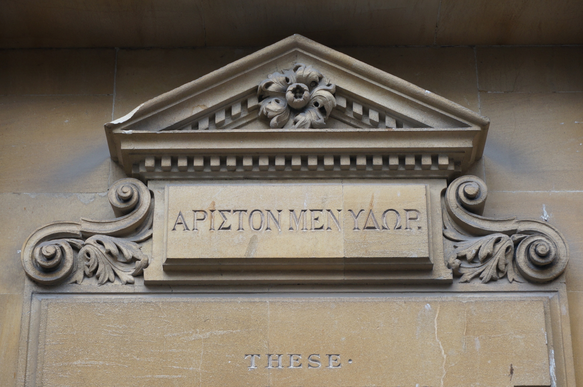 Notwithstanding pathogens, the inscription below roughly means ‘water is best’ (apparently the phrase is untranslatable into English, on account of its idiomatic use of antithesis. It’d literally render something like ‘on the other hand, water’.